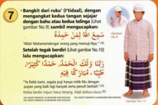 7. • Bangkit dari ruku’ (I’tidaal), dengan mengangkat kedua tangan sejajar dengan bahu atau kedua telinga sambil mengucapkan: